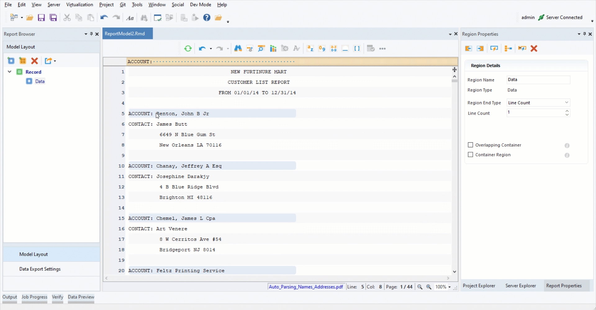 If you look at it, the Account field contains full name with title. We want to extract and parse this information into Suffix, First Name, Middle Name, Last Name and Prefix.
