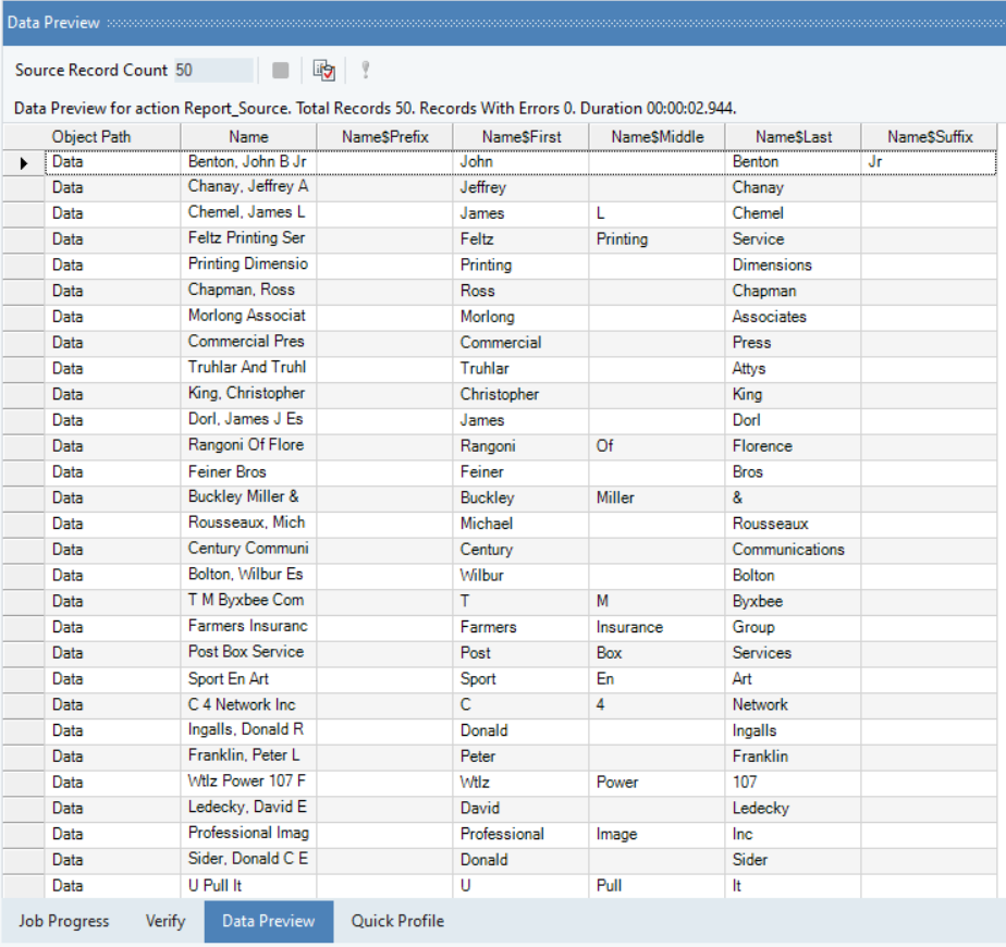 Astera allows users to process an input stream of name data and returns it into its constituent elements such as first name, middle name and last name, as parsed output with the help of the built-in auto-parsing feature.