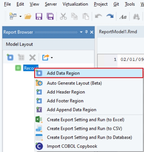 1. Right click on the Record node present in the Model Layout panel and click Add Data Region.