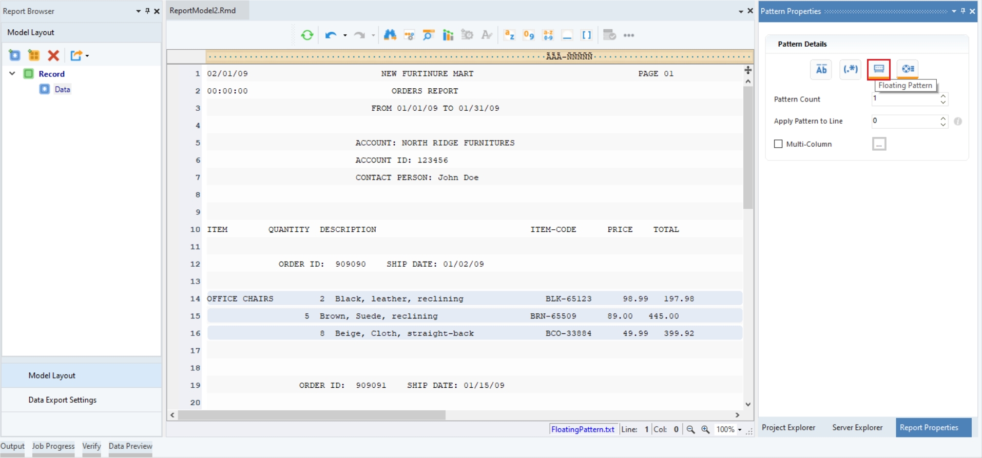 A floating field pattern in Astera refers to the data points that are scattered throughout the report. The Floating Pattern option in Astera allows you to capture each data field no matter the location. With this option you must first specify a pattern in the pattern-matching bar and then check the Floating Pattern option. When the Floating Pattern option is enabled, it will capture all the lines that match the specified pattern.