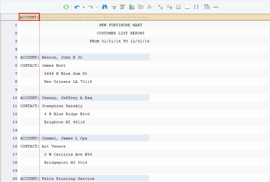 This file contains a customer list report including their account name, contact, and address details.