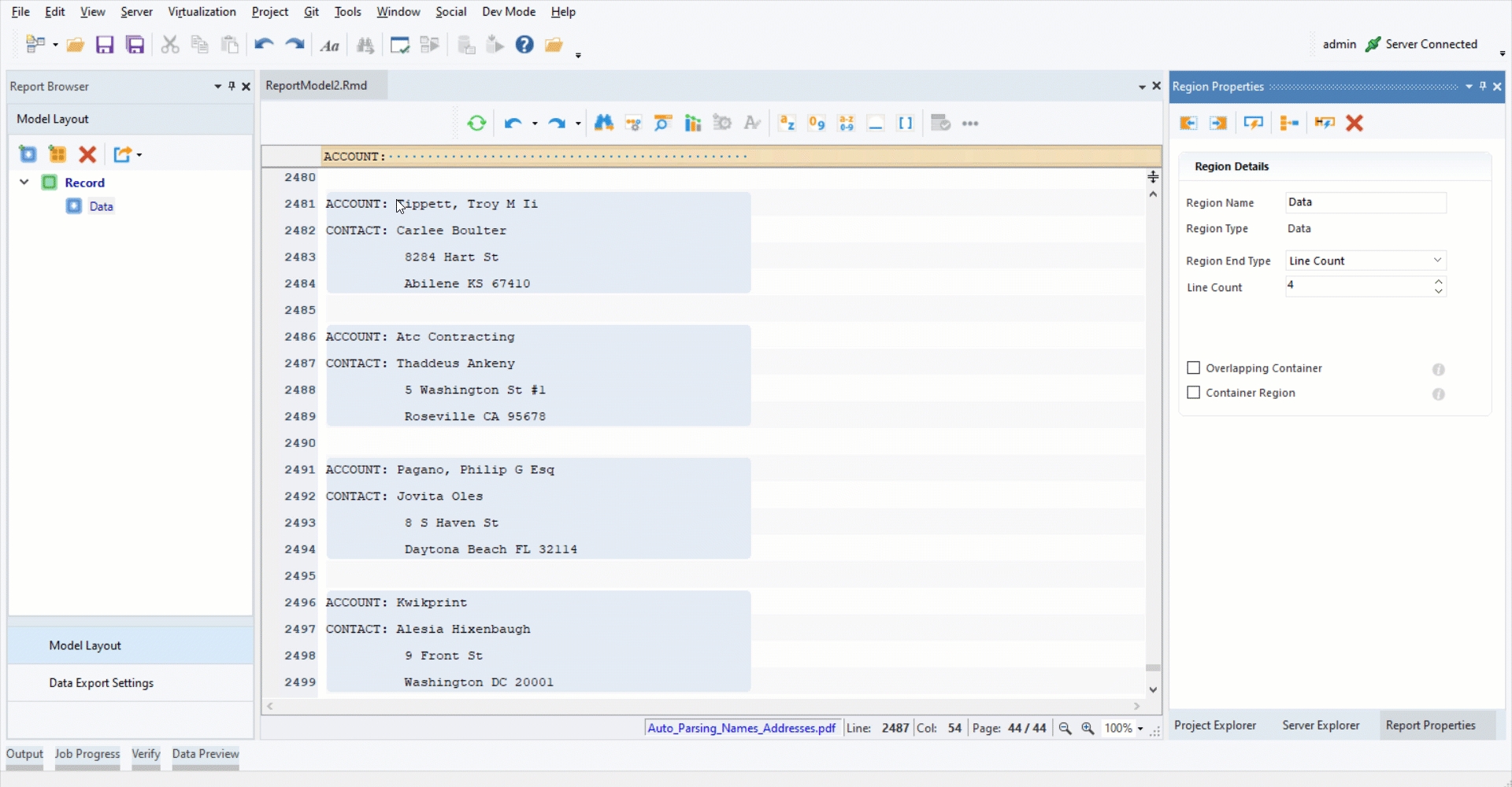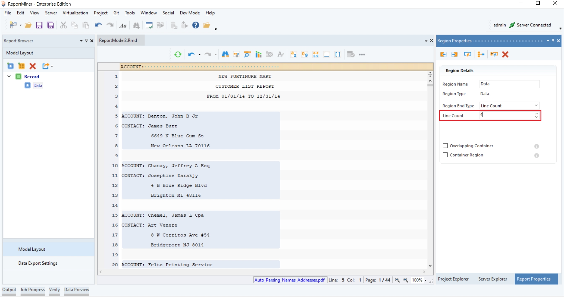 You can see that a single record spans over 4 lines on this PDF file. In order to capture this data and place it into different fields, we will use the Line Count feature.