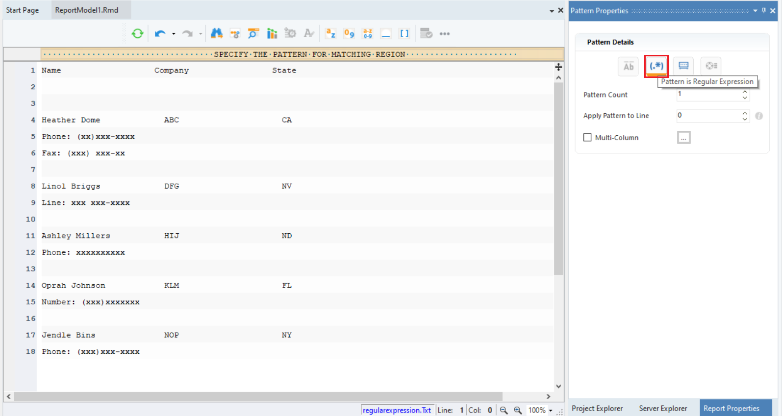 Select the Pattern is a Regular Expression icon present in the Pattern Properties panel. This is done so that Astera can capture phone and fax numbers that have been formatted differently, through a regular expression.