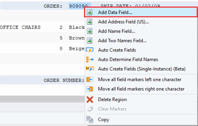 3. To create the data field, select the data, right-click on it and select the Add Data Field option from the context menu. Rename the field to Order_ID.