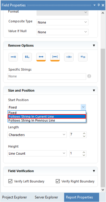 In Astera, you can manually specify the start position of a selected data field in the Field Properties panel. There are three options available in the drop-down menu to specify the Start Position, as shown below.