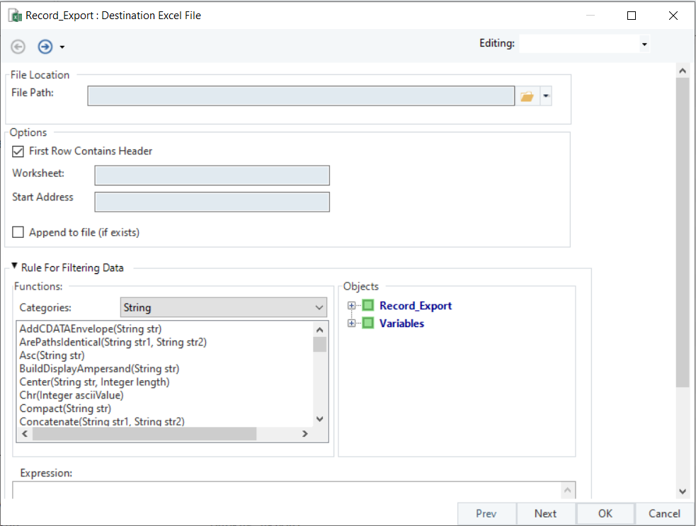 An expression box with built-in functions will open. Expand the Record_Export node to access the fields of the extracted data.