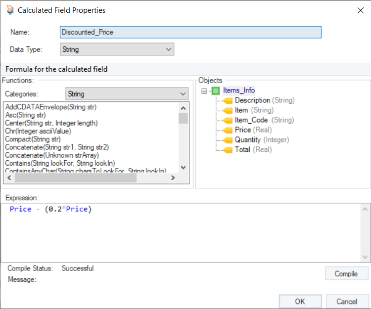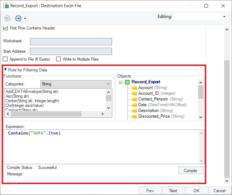 For this, we will write Contains(”SOFA”,Item) in the Expression builder. Click the Compile button to verify your expression.