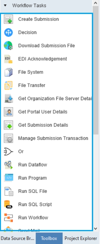 The Run Dataflow Task is placed under Workflow Tasks section of the Toolbox.