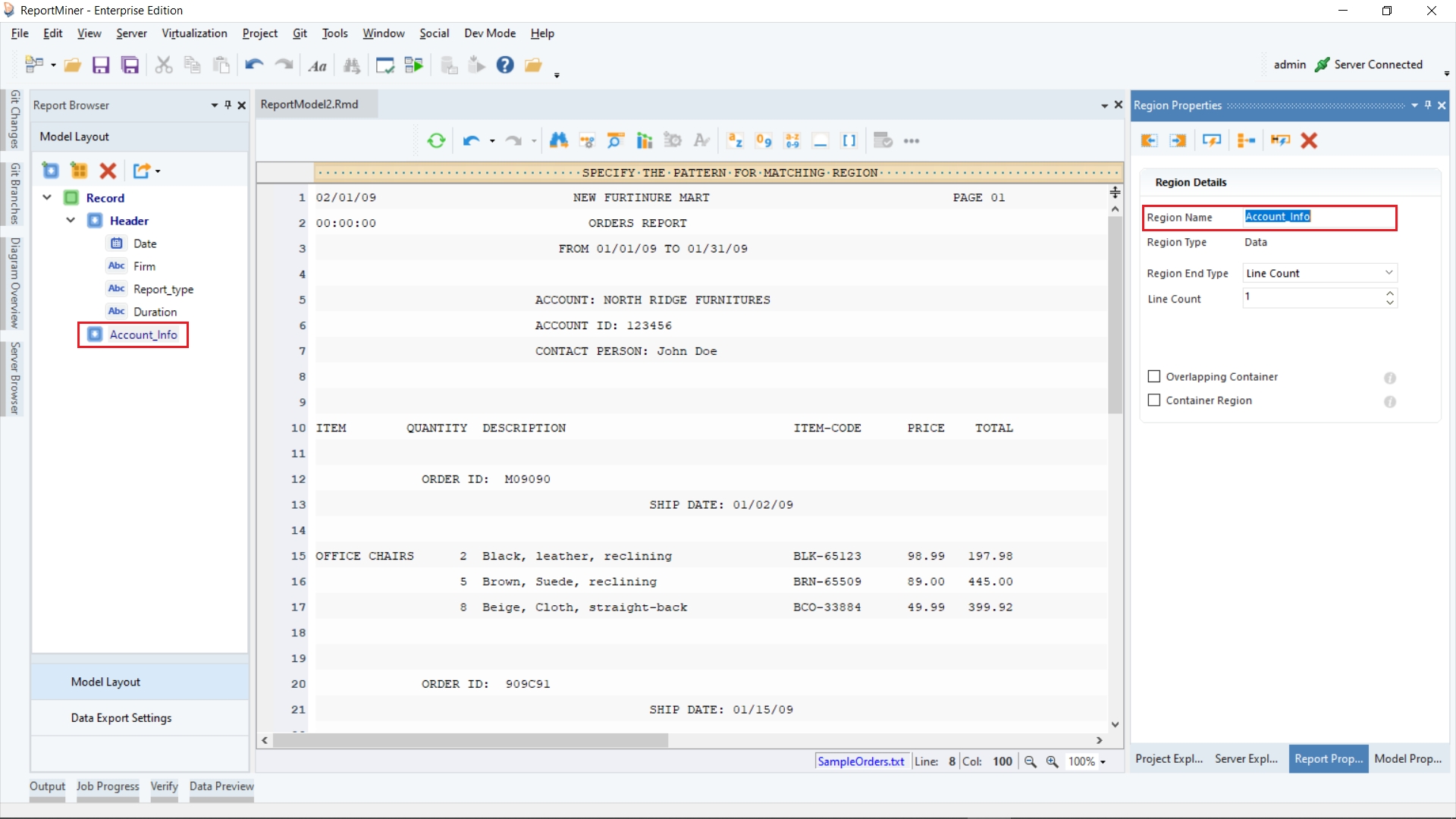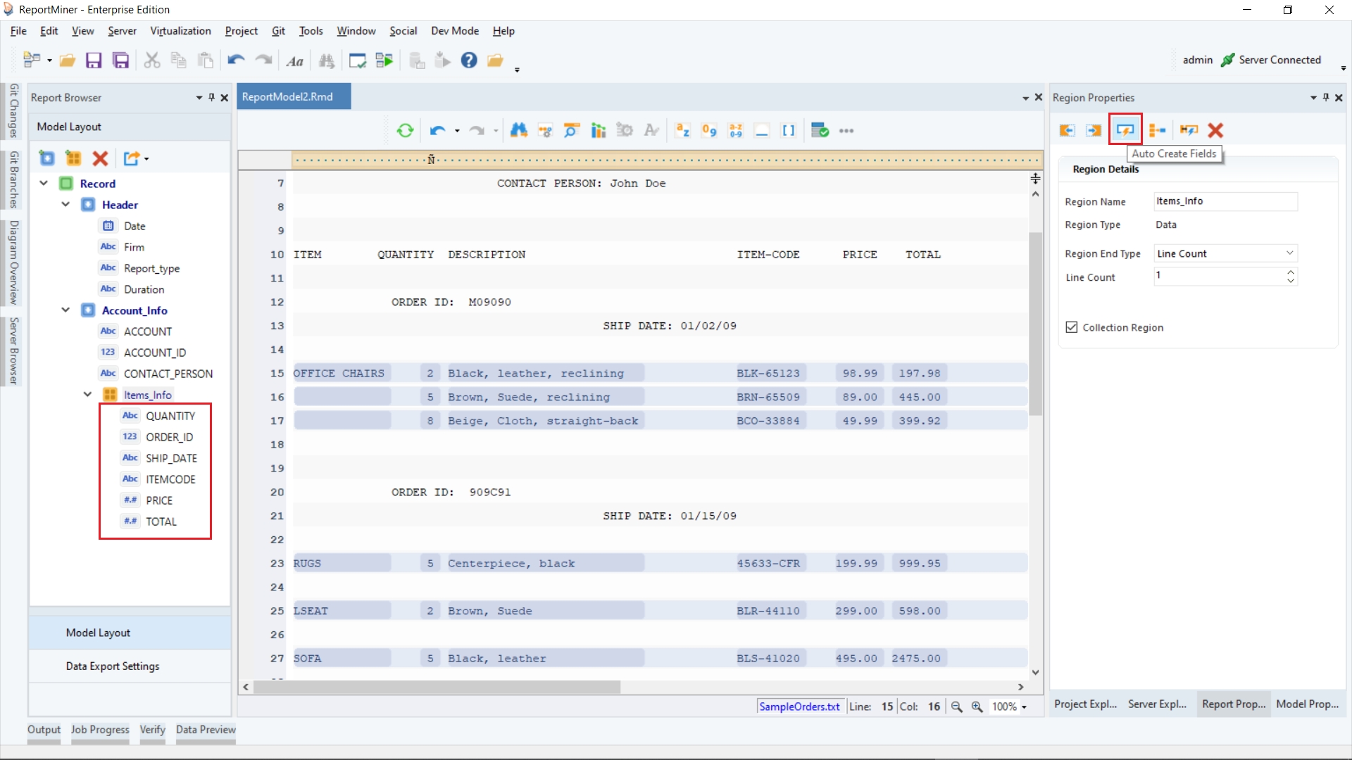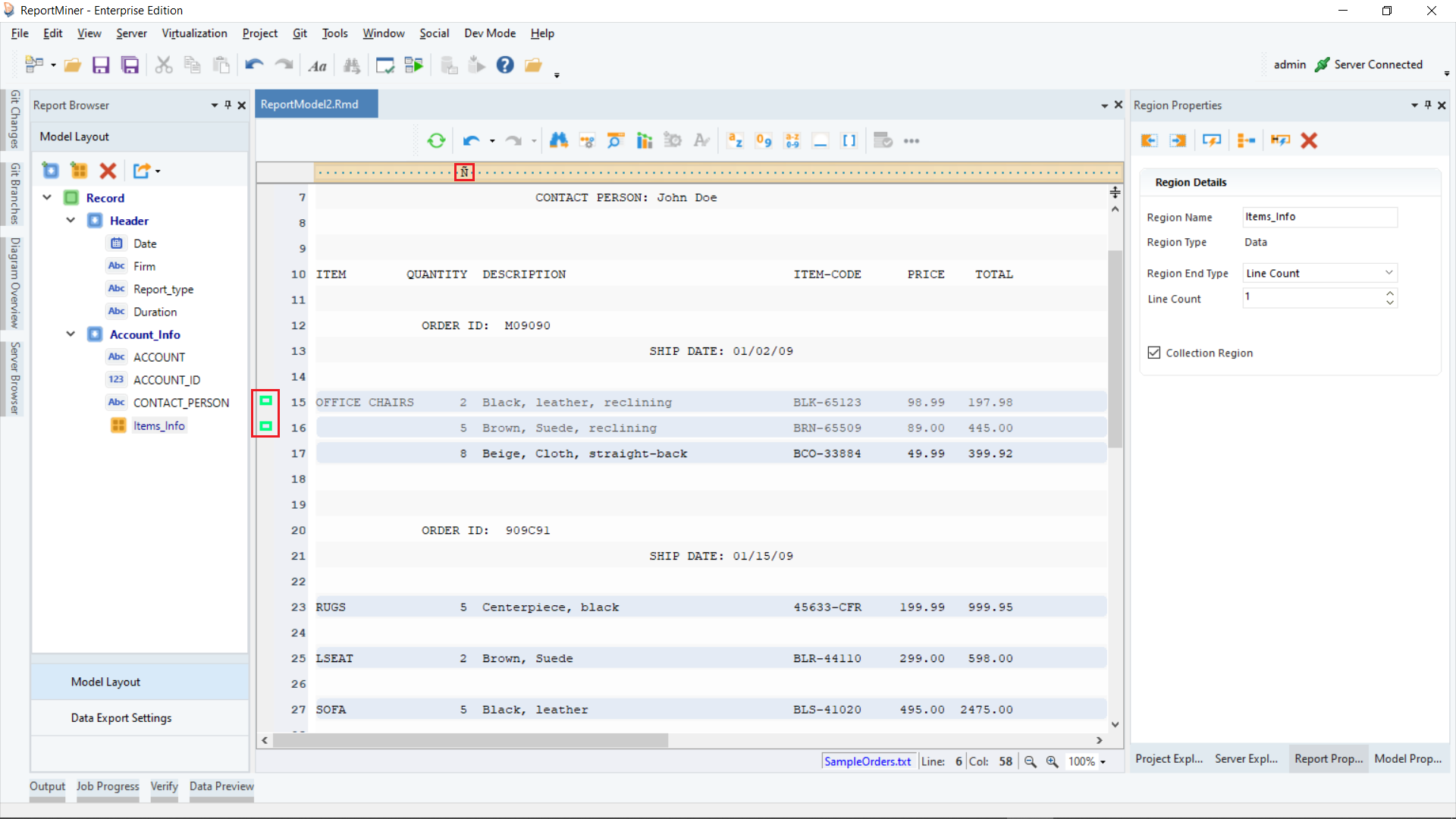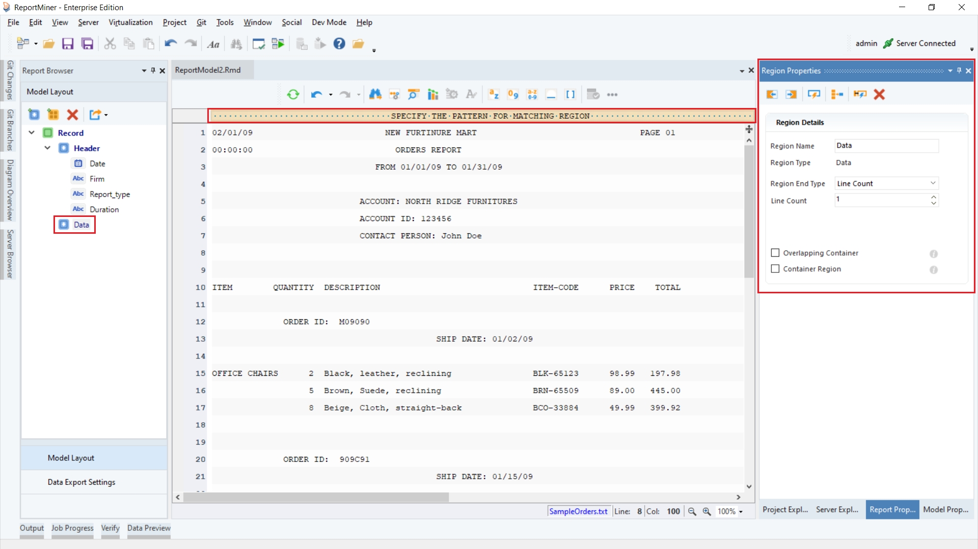 Click OK. The text file containing Orders invoice data will display on report model’s designer.