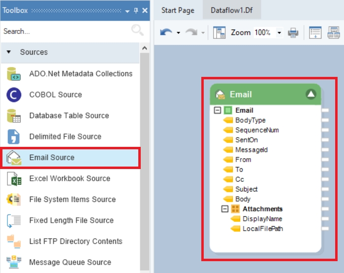 Under the Sources section in the Toolbox, you will find the Email Source object.