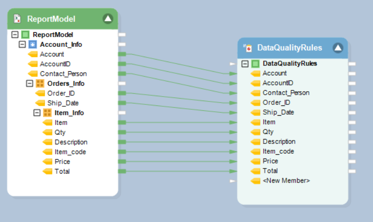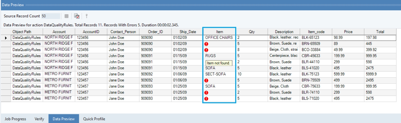 In this example, a Data Quality Rule is applied to identify null records in the Items field as errors with an error message: “Item not found”.