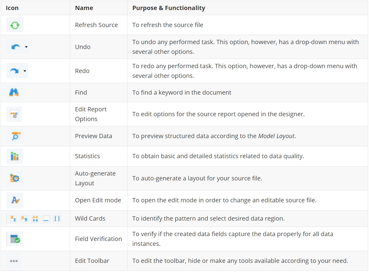 The toolbar has various options that facilitate the data extraction process. The purpose and functionality of the icons present in the toolbar are discussed below: