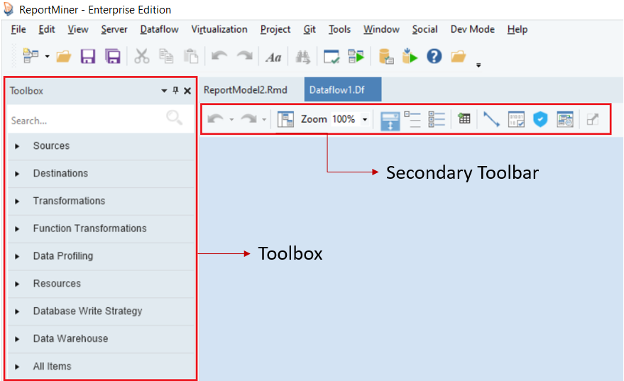 A new dataflow will open in Astera. You can see that a Toolbox and a secondary toolbar has been added to the designer.