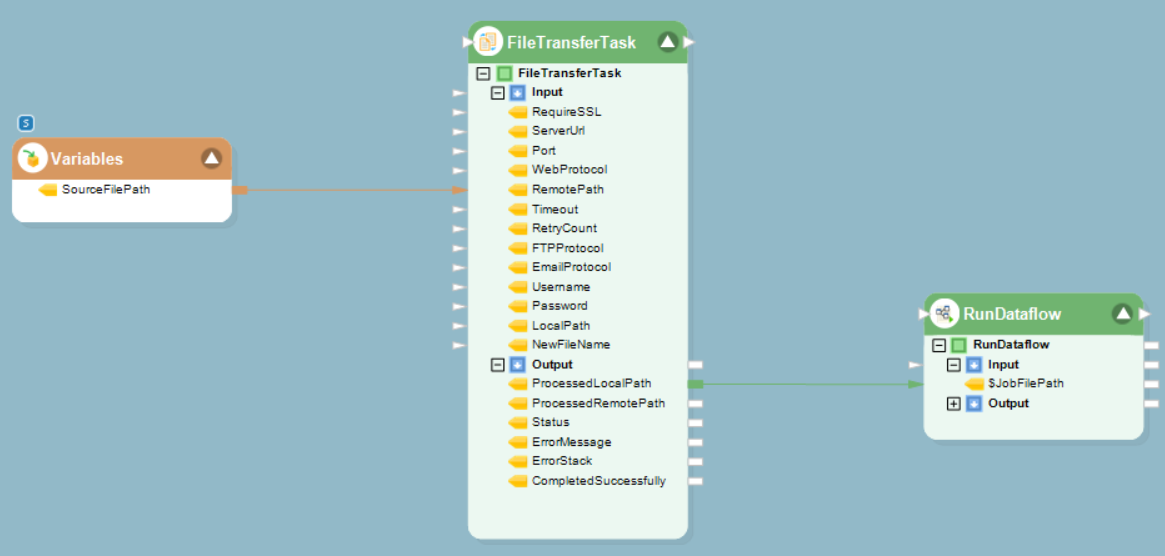 We will pass the name of the file that we want to download and process to the FileTransferTask from the Variables object. The Variables object takes an input from the REST call sent through Postman, and passes it to FTP to download the file with that name. We then pass the file path of the downloaded file to the RunDataflow object.