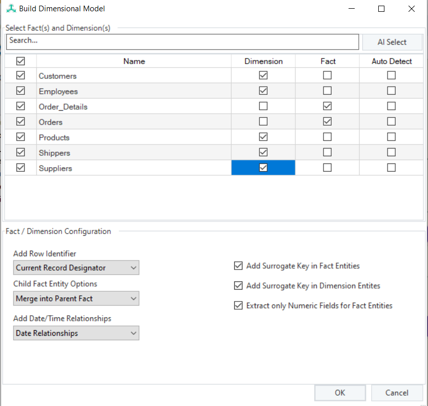 Alternatively, you can use the Build Dimensional Model option to automate the process of dimensional modelling. For more information on using the Build Dimensional Model option, click here.