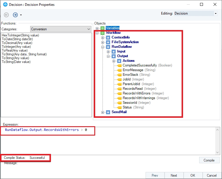 In the Expression input box, enter an expression. This expression should return a Boolean result, such as True or False. An example of this expression is shown below. The expression here is based on the presence of erroneous records in a Run Dataflow task object.
