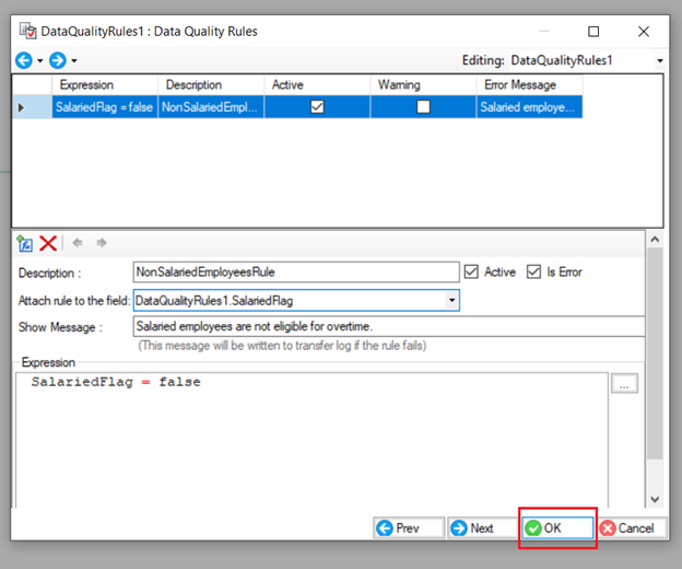 In this example, we want to validate records with the Salary Flag ‘False.’ So, we’ll write the expression: