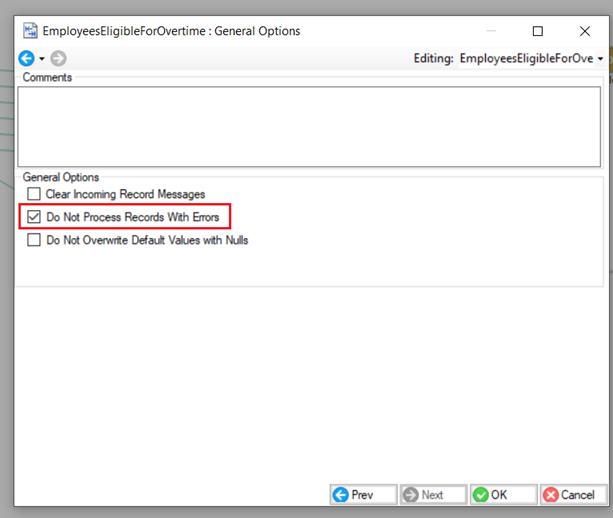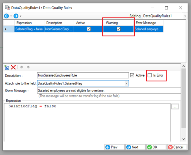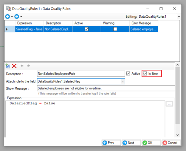 * *Show Message:* We can also write a message to show up with the errors, which can also be written to the error log. Let’s write a message: *Salaried employees are not eligible for overtime.*