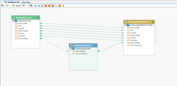 So now that we have validated the records against our data quality rule, we can map it to a target which is a delimited file in this case. You can see that it’s named *Employees eligible for overtime*, so the records of employees with the *False* salaried flag will be passing through the Data Quality Rules and mapped to the destination file. Let’s do the mapping.