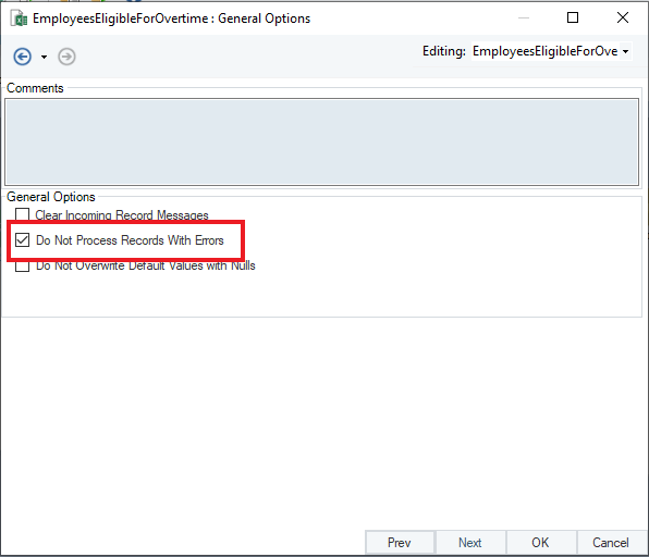 * *Show Message*: We can also write a message to show up with the errors, which can also be written to the error log. Let’s write a message: ‘Salaried employees are not eligible for overtime.’