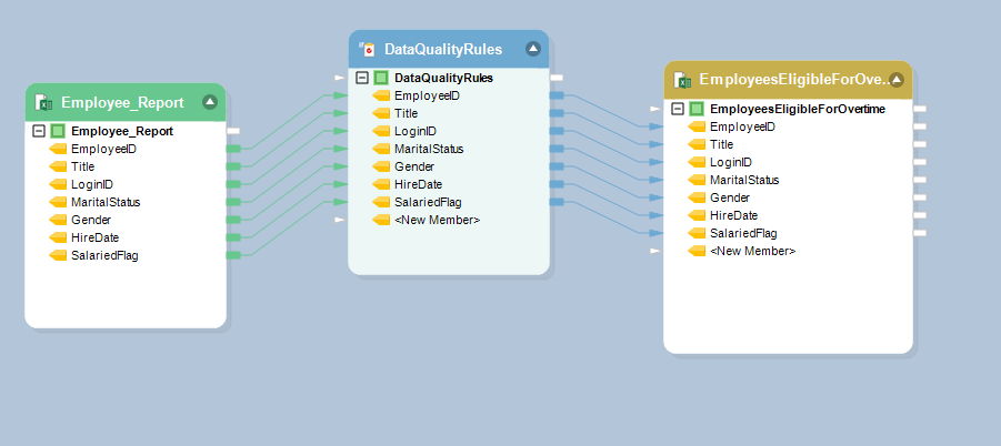 We will name this file ‘Employees eligible for overtime,’ so the records of employees with the ‘False’ salaried flag will be passed through the *Data Quality Rules* object and consequently be mapped to the destination file. Let’s do the mapping.