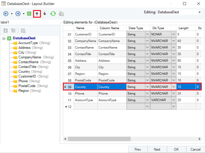 For example: To move the Country field right below the Region field, select the row and click the Move up button in the toolbar at the top, to move the field up from the 9th to the 8th position.