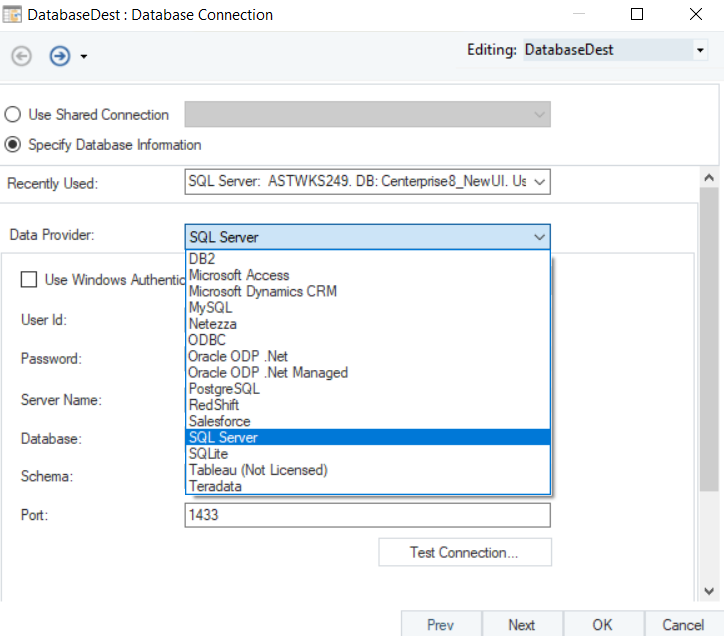 This is where you select the specific database provider you want to connect to. For instance, if you want to write your data to a SQL database, select SQL Server from the list. The connection details will vary according to the data provider selected.