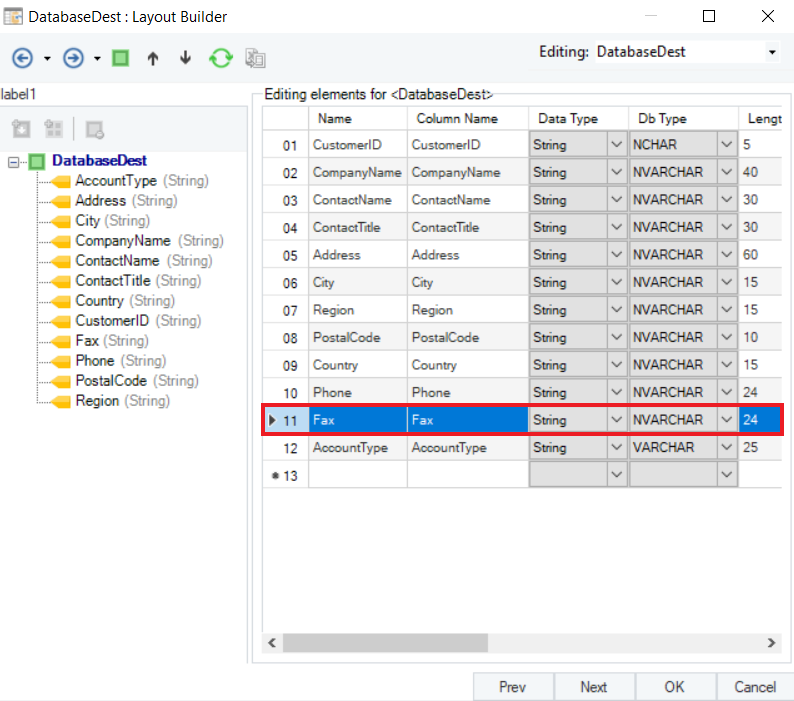 To add a new field to the layout, go to the last row of the layout (Name column), which will be blank and double-click on it, and a blinking text cursor will appear. Type in the name of the field to be added, and select the properties for it. A new field will be added to the destination table’s layout.