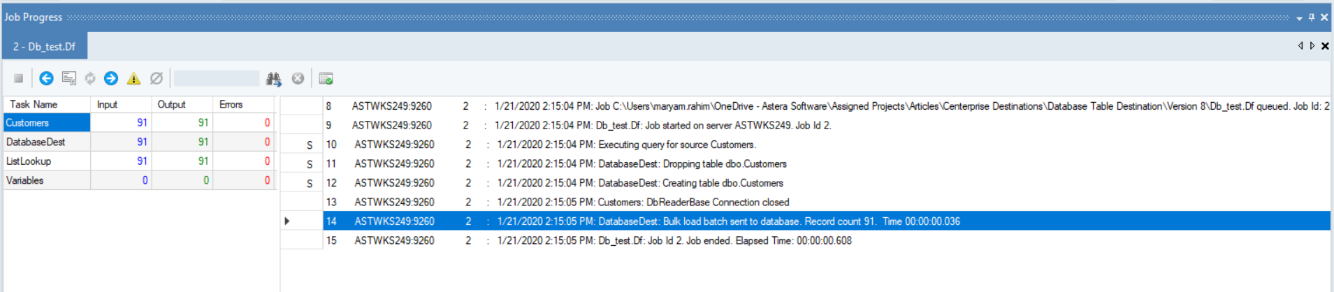 The Database Table Destination object is now successfully configured, and the destination file can now be created by running the dataflow.