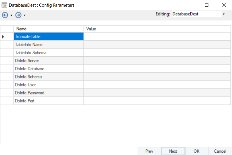 If you look at it, the Database Table Destination object is empty right now, as in, it does not have any fields or mappings. This is because the object has not been configured yet. There are two empty sub-nodes for Input and Output under the DatabaseDest root node.