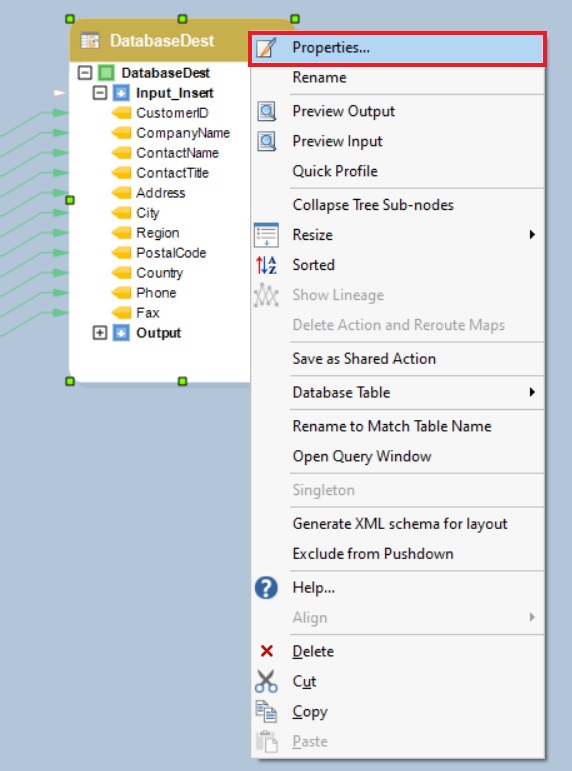 To configure the properties of the Database Table Destination object, right-click on the header and select Properties from the context menu.