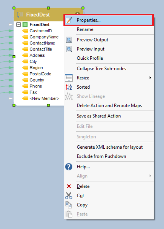 1. To configure the *Fixed Length File Destination* object, right-click on the header, select *Properties* from the context menu, and a dialogue box will open.