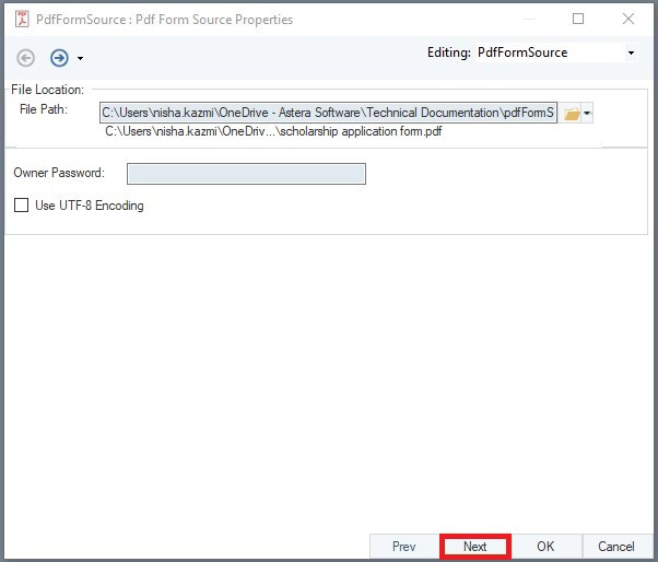 * *Owner Password*: If the file is protected, then enter the password that is configured by the owner of the fillable PDF document. If the file is not protected, this option can be left blank.