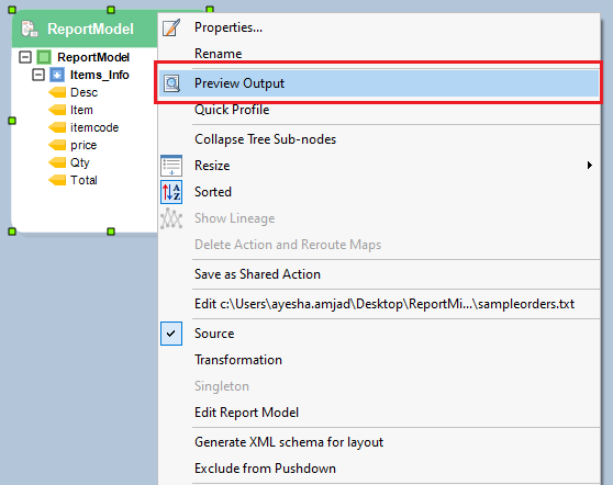 5. Right-click on the *Report Source* object’s header and select *Preview Output* from the context menu.