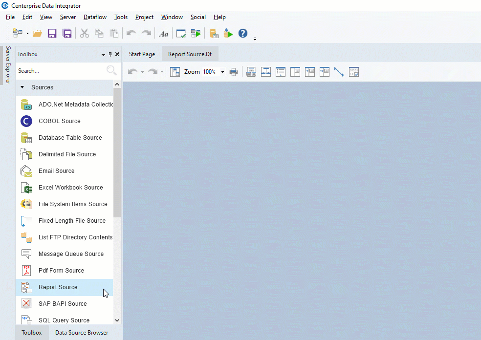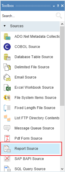 1. To get a *Report Source* object from the Toolbox, go to *Toolbox > Sources > Report Source.* If you are unable to see the Toolbox, go to *View > Toolbox* or press Ctrl + Alt + X.