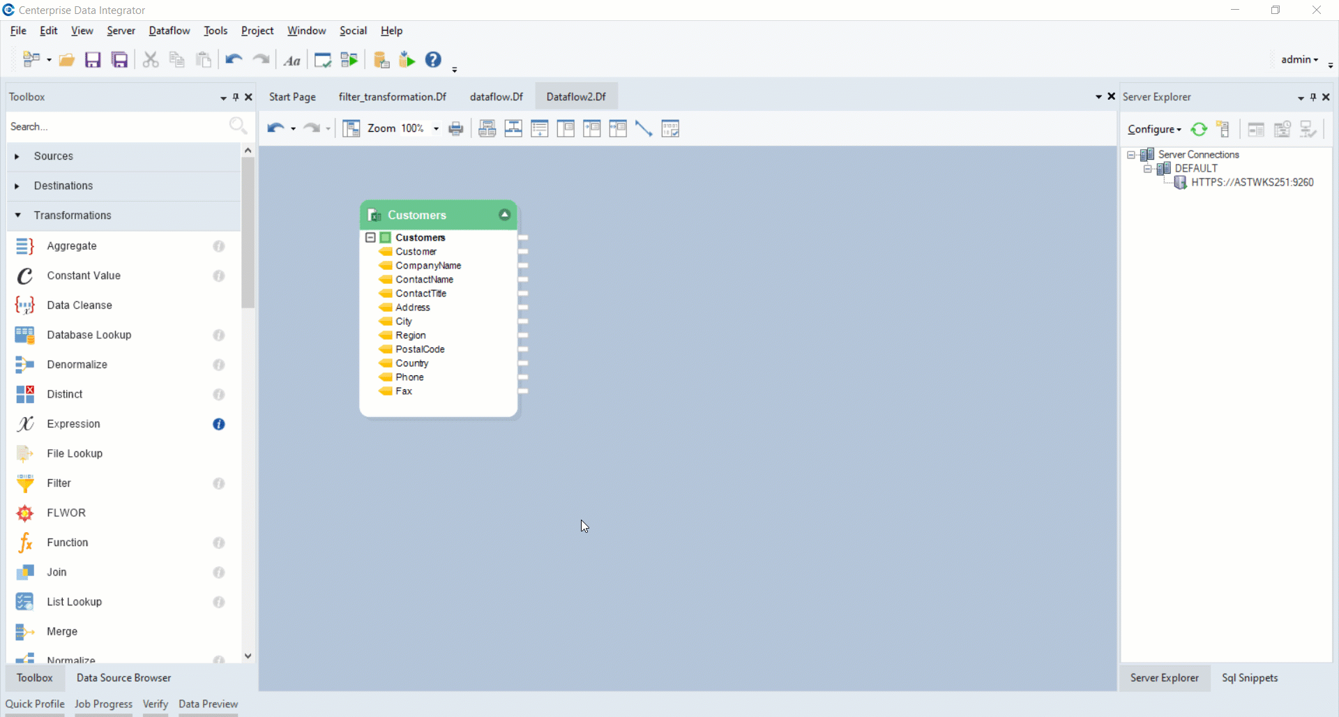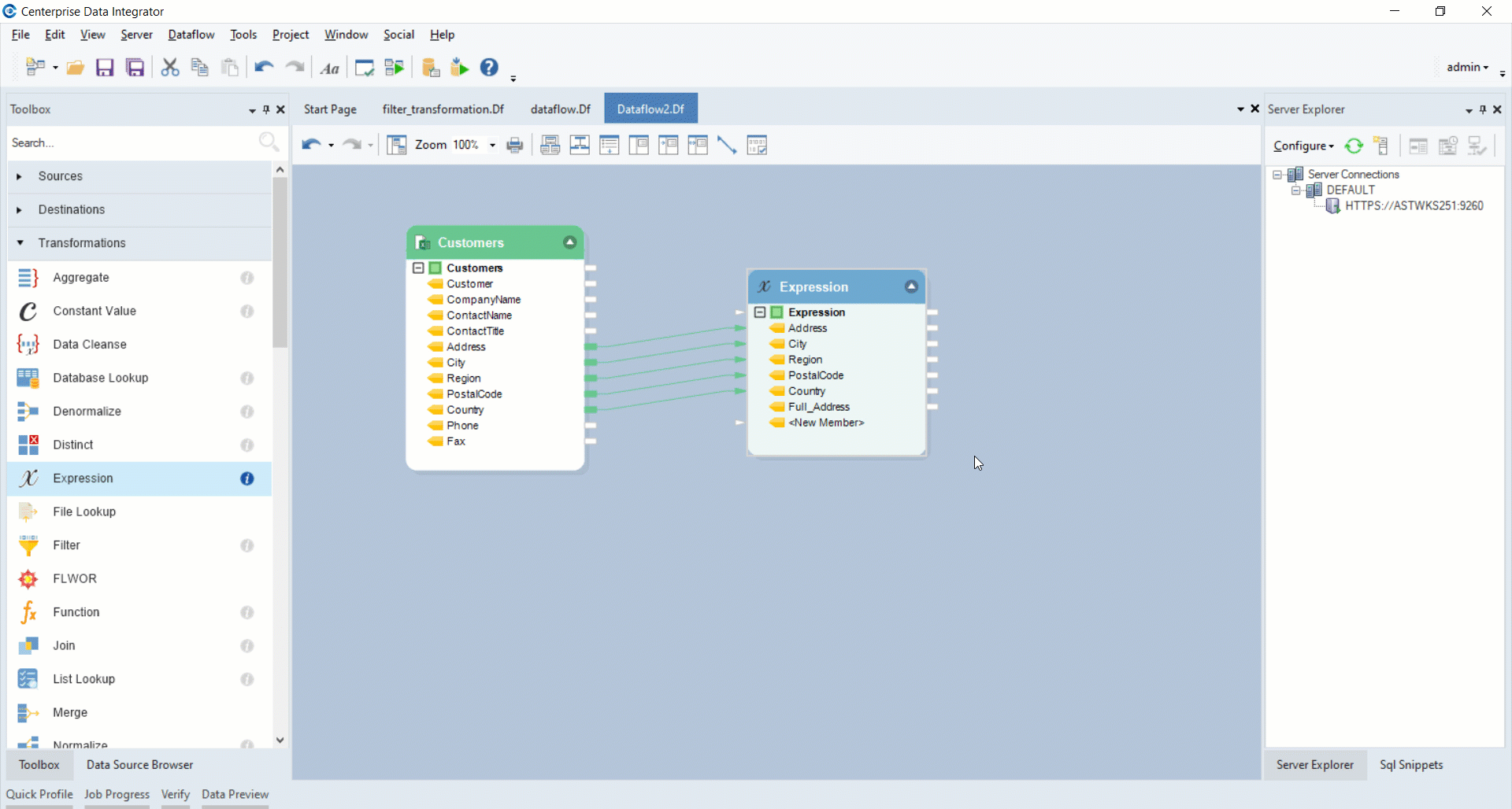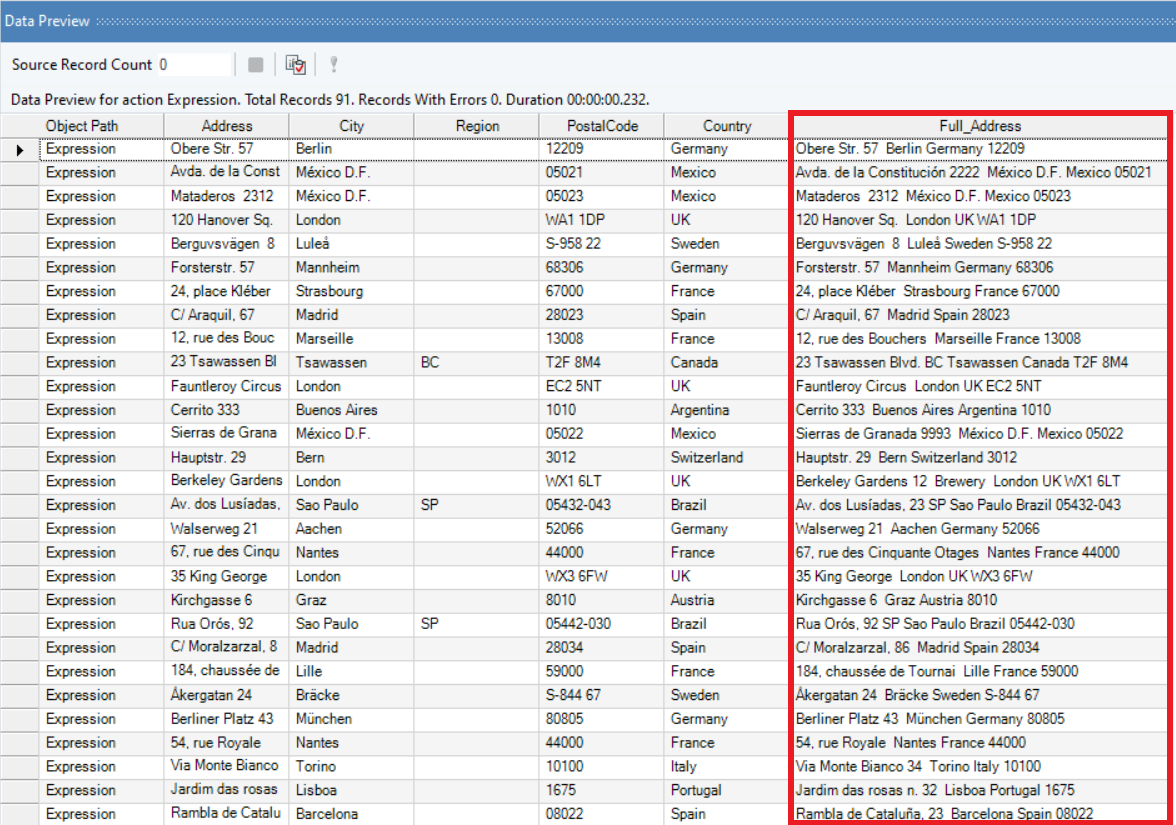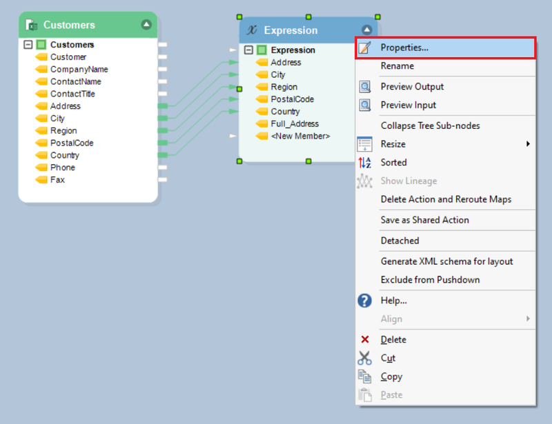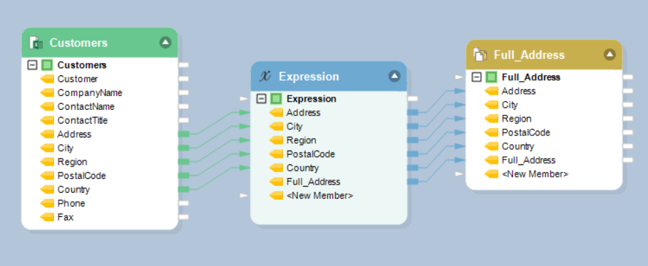 In this example, we have a sample dataset, *Customers*, stored in an Excel file. The address information in this source is split into multiple fields such as *Address*, *Region*, *Country*, and *PostalCode*. We want to concatenate the information in these fields and return it as full address in a new data field. For this, we will use the *Expression* transformation object.