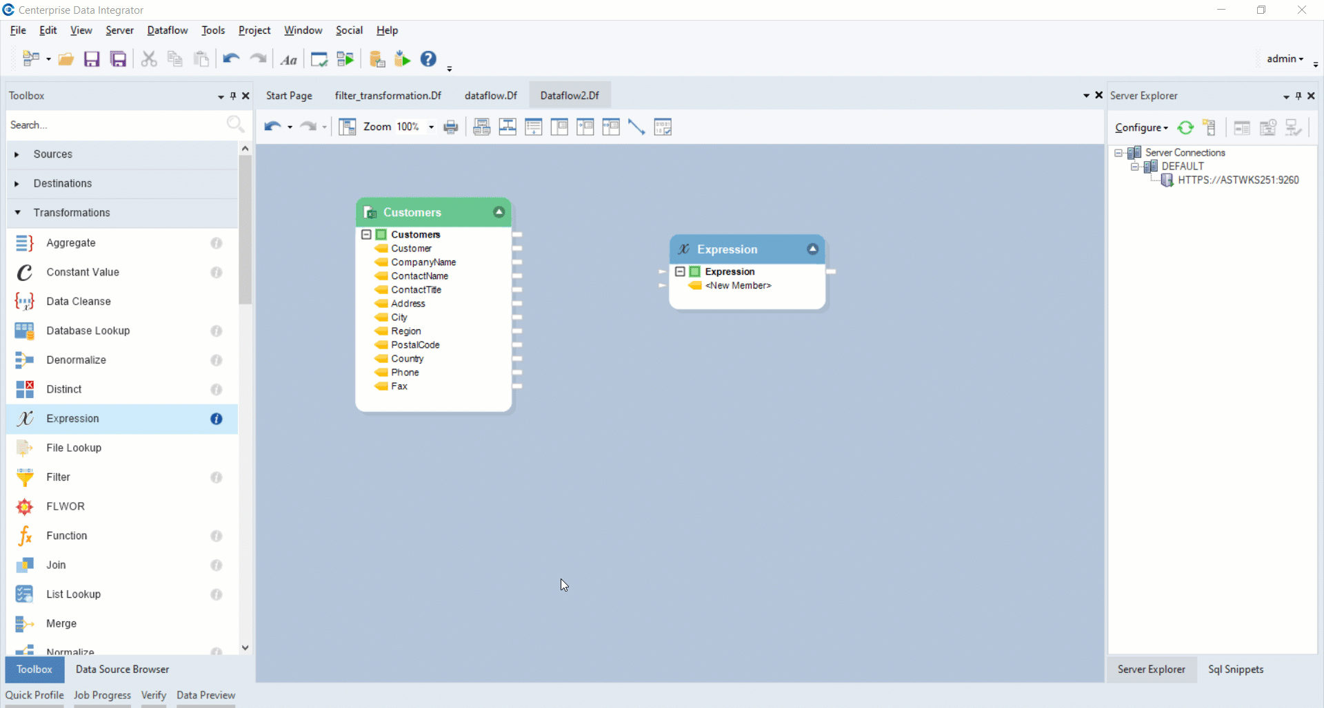2. Drag-and-drop the *Expression* transformation object from *Toolbox>Transformations > Expression* onto the designer.