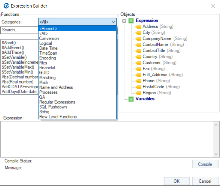 * *Expressions:* Here, you can write an expression rule or choose one from the built-in functions in Astera.