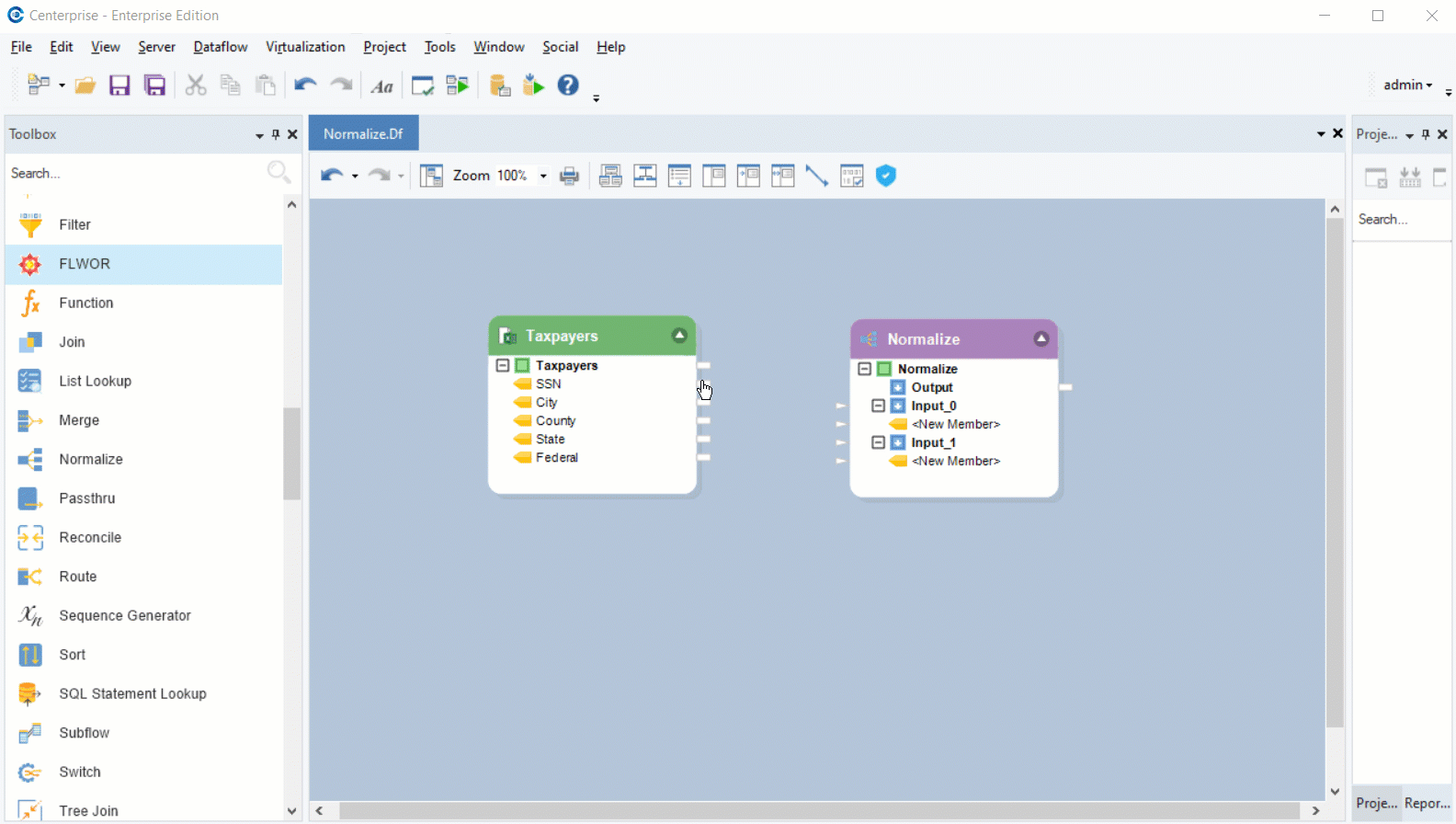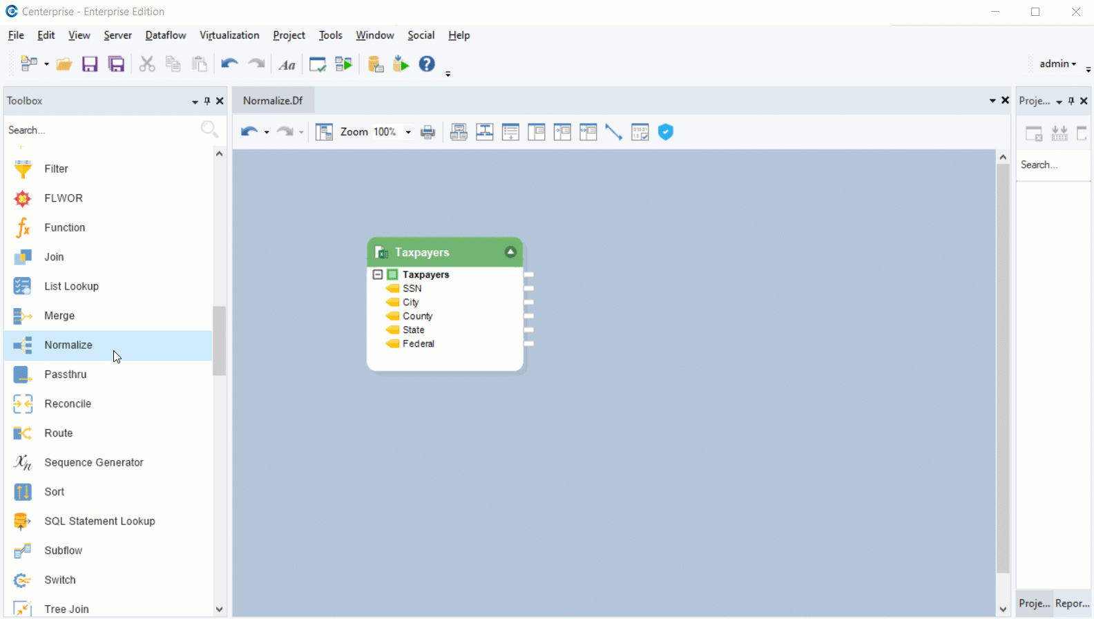 Our goal is to reduce the number of fields and increase the number of records by specifying the tax type in one consolidated field. To do this, we will use the *Normalize* object in the Astera Data Stack.