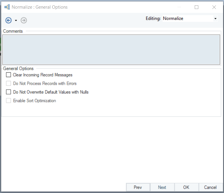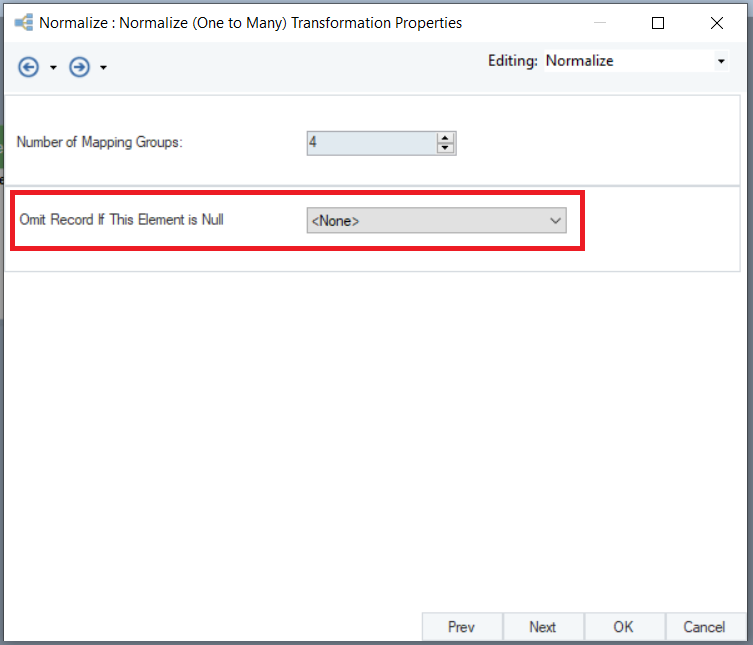 5. In the *Normalize (One to Many) Transformation Properties* window, make appropriate selections for the following options: