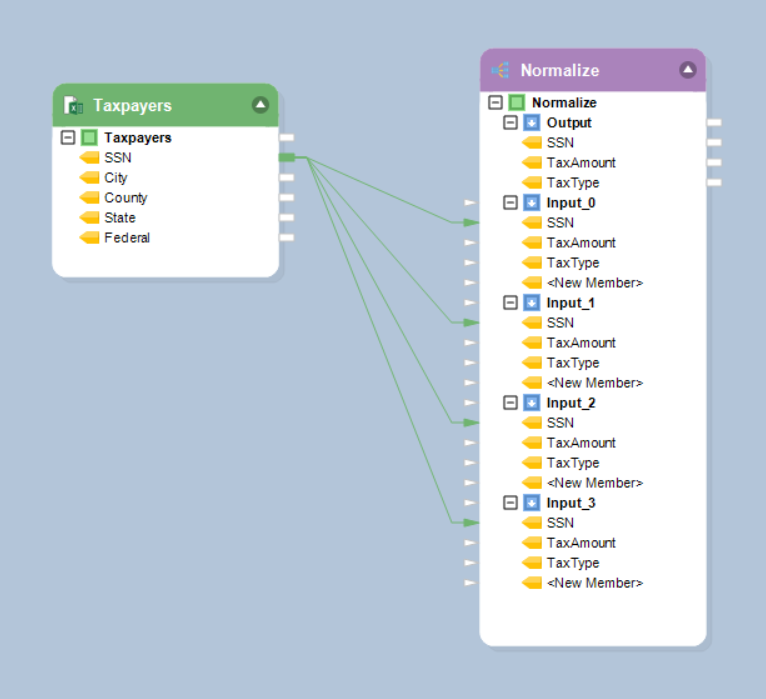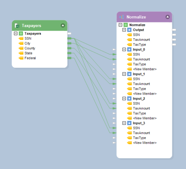 * Map *SSN* from the *Excel Workbook Source* object to *SSN* in all four input nodes of the *Normalize* object.