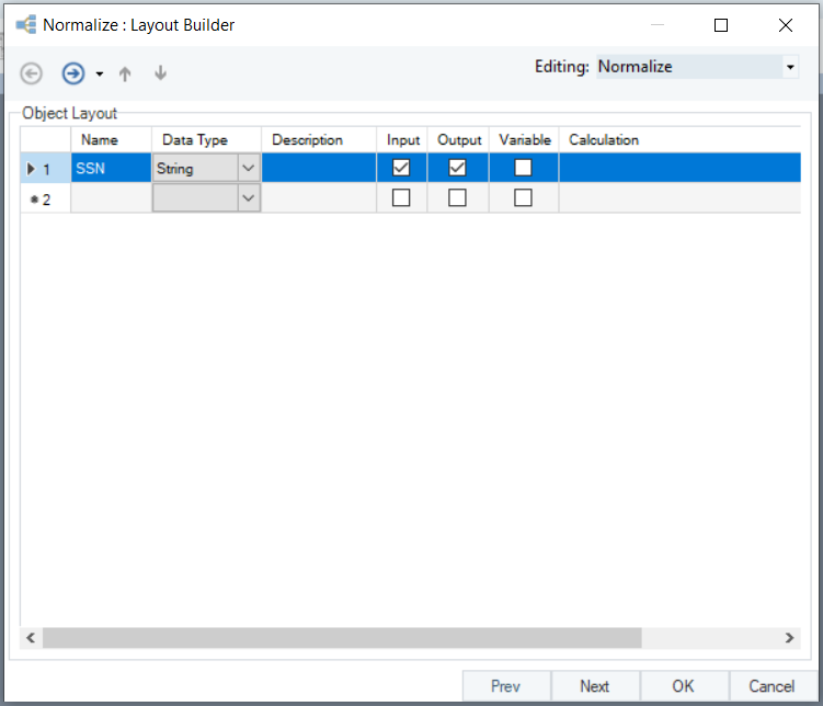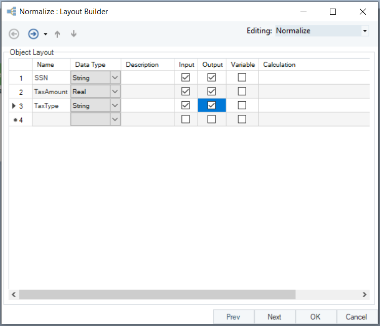 4. In the *Layout Builder* window, create the layout of your normalized dataset by providing field names. In this case, we have already mapped *SSN* from the source and will create two new fields, one for the *TaxAmount* and the other for the *TaxType*.