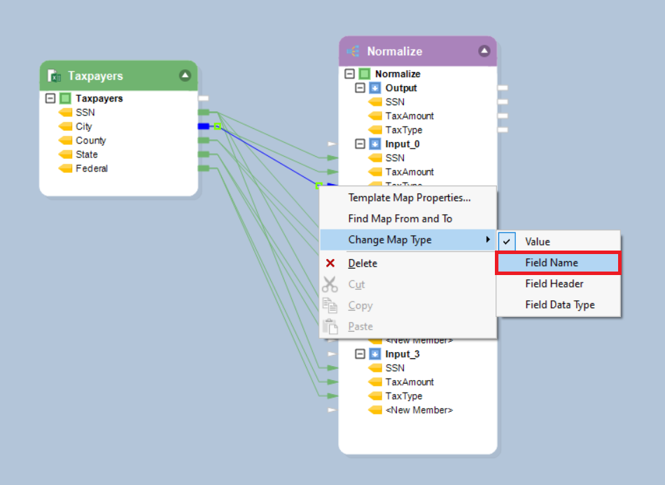 * To map field names, right-click on the mapping link, hover over *Change Map Type*, and select *Field Name*.