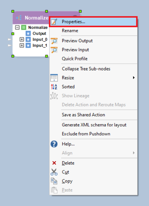 3. Right-click on the header of the *Normalize* object and select *Properties* from the context menu.