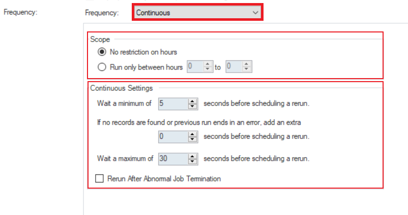 * *Scope*: You can select *No restriction on hours* if there is no specific time frame to run the job or specify an hourly window in the *Run only between hours* option.
