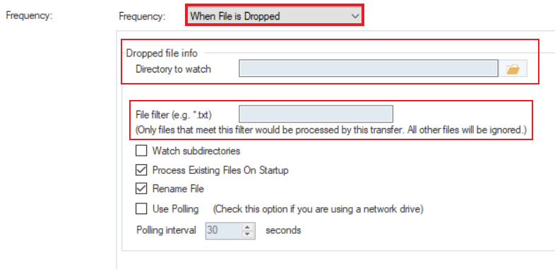 5. Once the *File Path* has been provided, you can set the *Frequency* of the schedule.