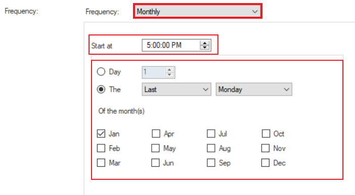 In this case, we will set the *Frequency* of the schedule to run *Monthly*, every last Friday of a quarter, at 5 pm.