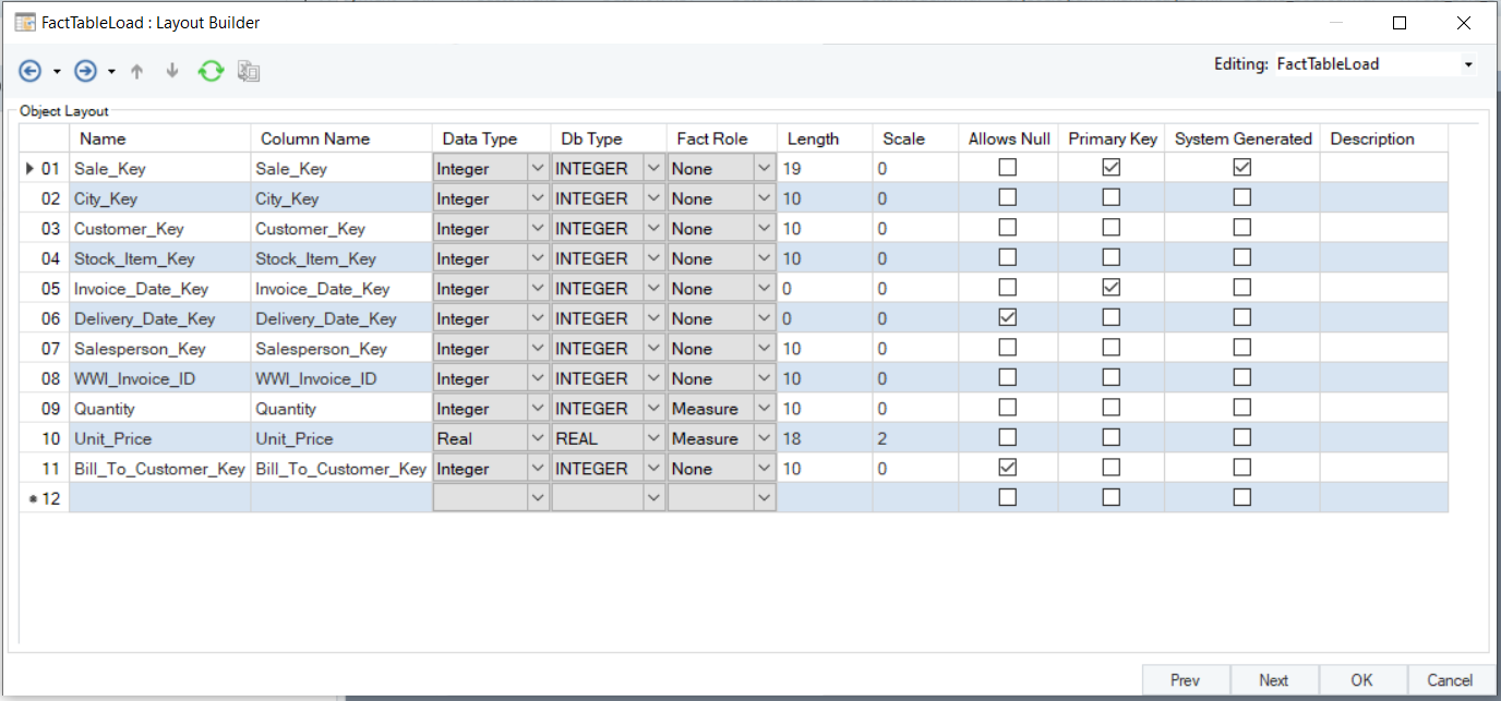 Click *Next* to move to the *Layout Builder* screen. Here, you can view the layout of the fact table.