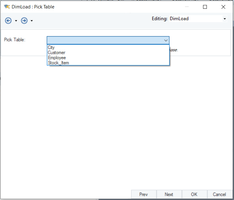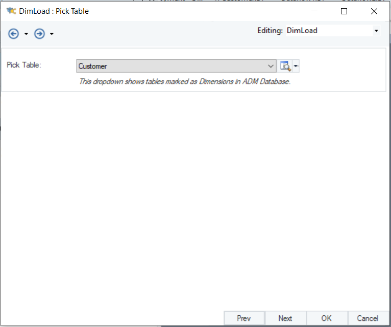 The *Pick Table* dropdown menu in the *Dimension Loader* object only shows tables that are marked as dimensions in the dimensional model.