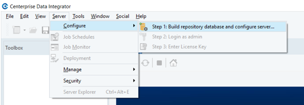 1. Go to *Server > Configure > Step 1: Build repository database and configure server*.
